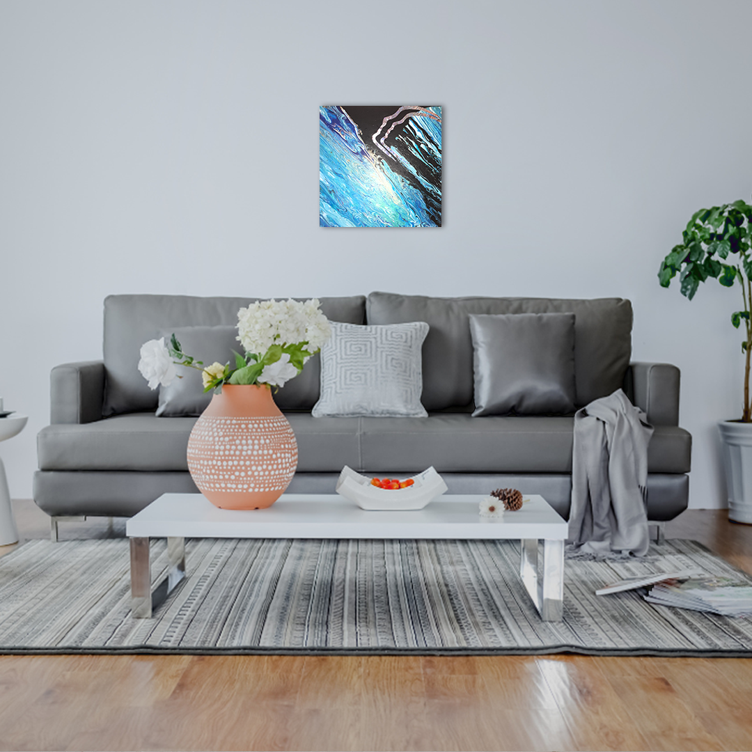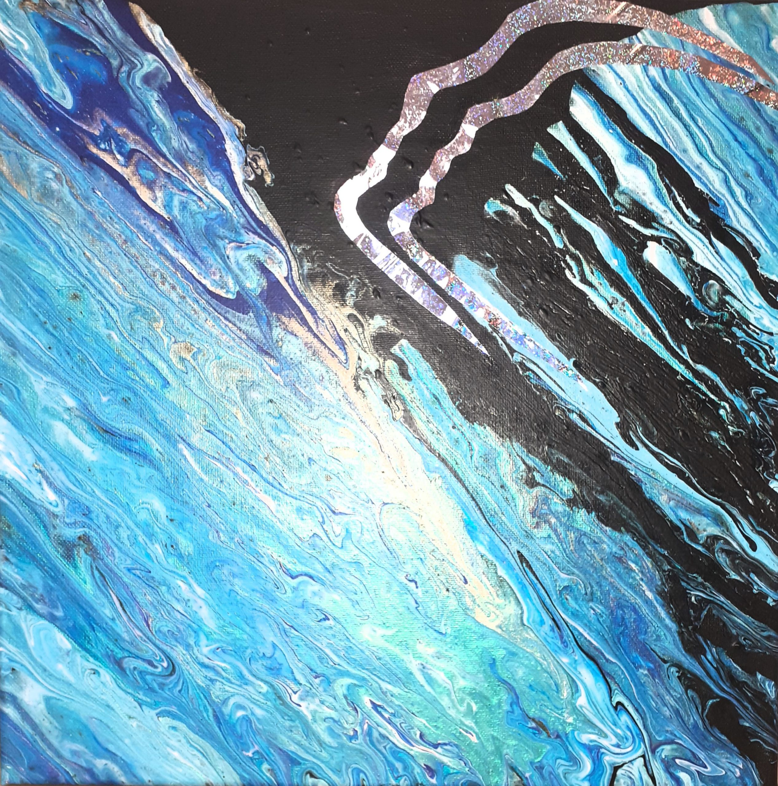 Acrylique sur toile lin 40 cm x 40cm, châssis bois, verni mat et collage miroir.