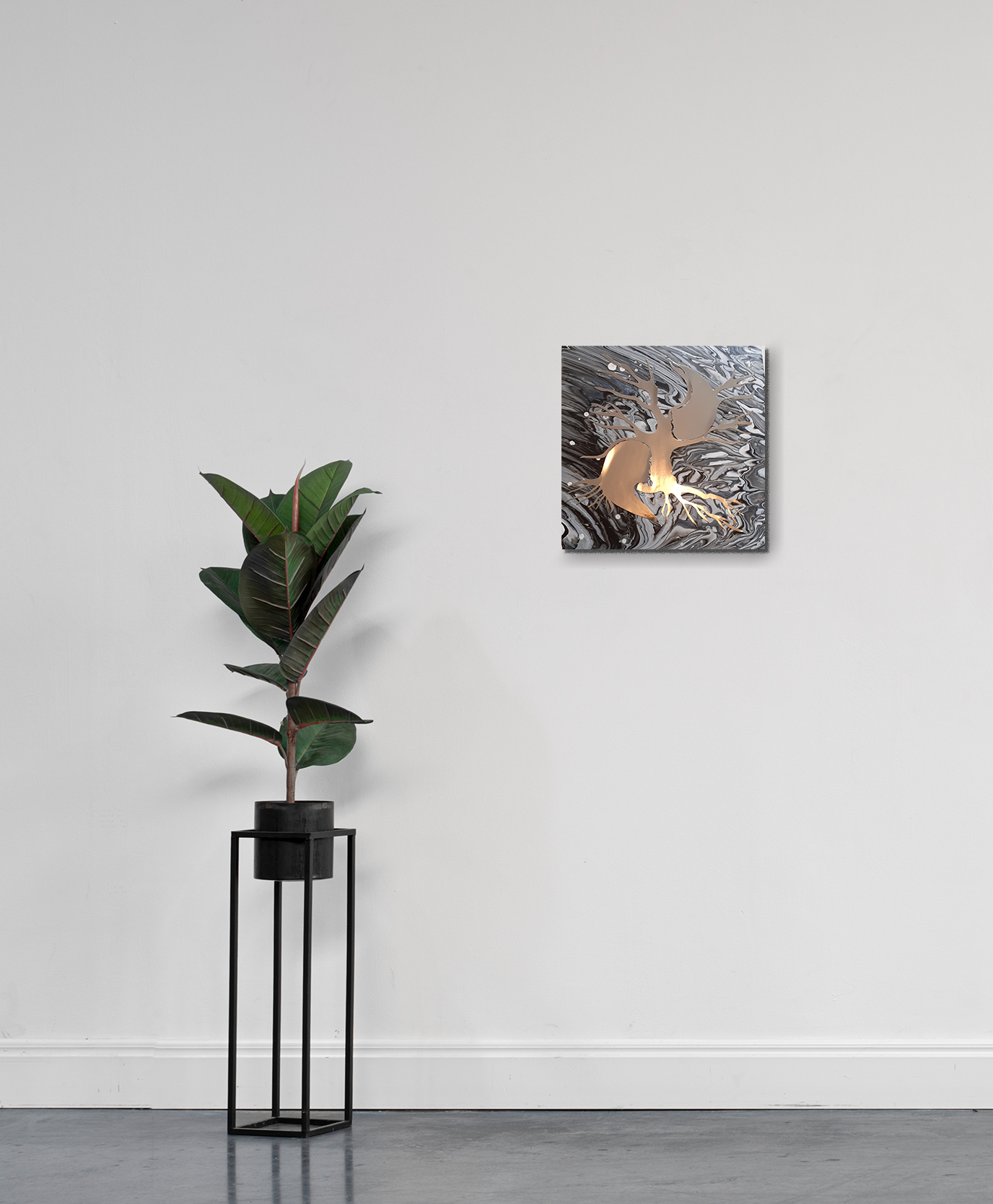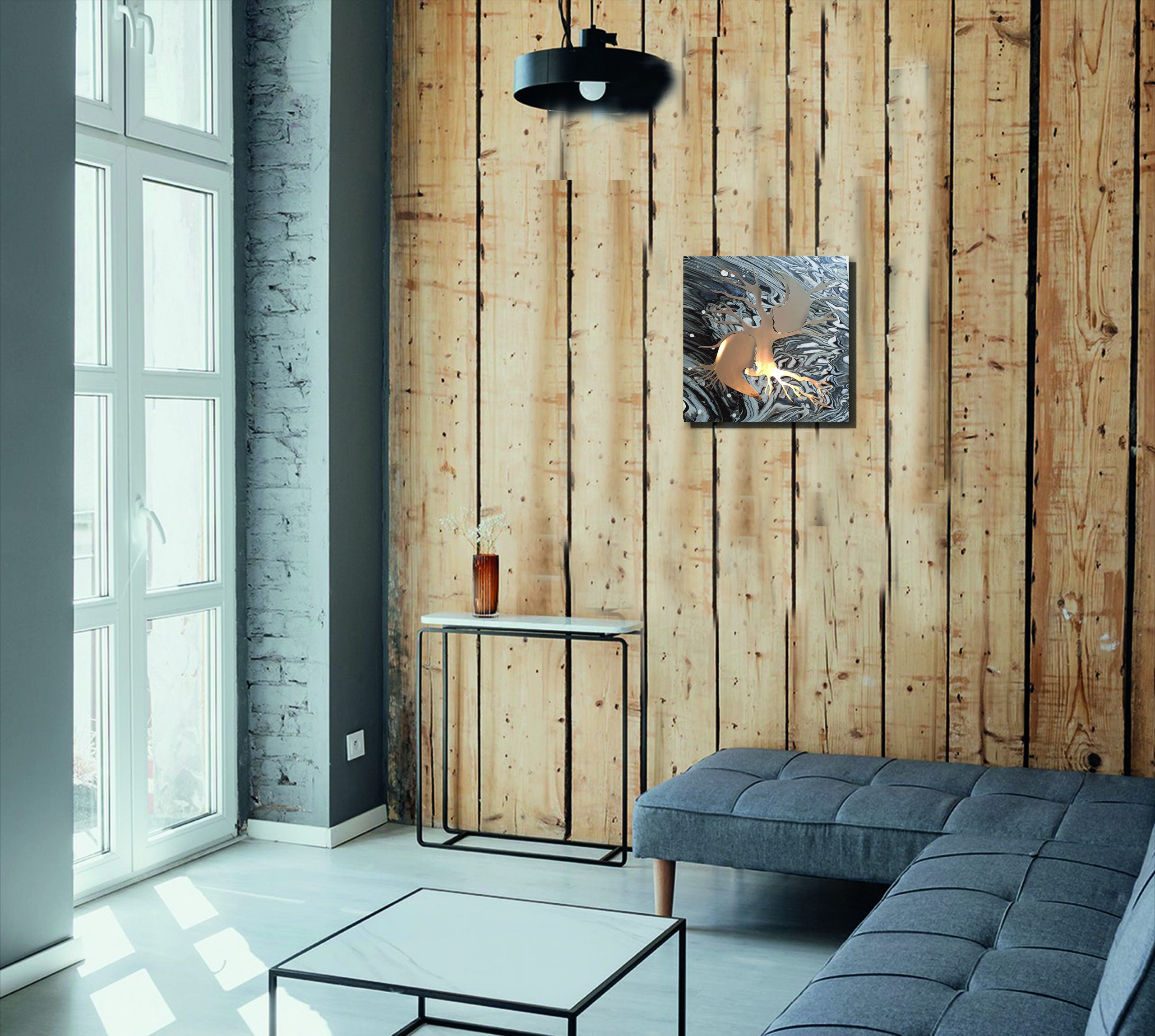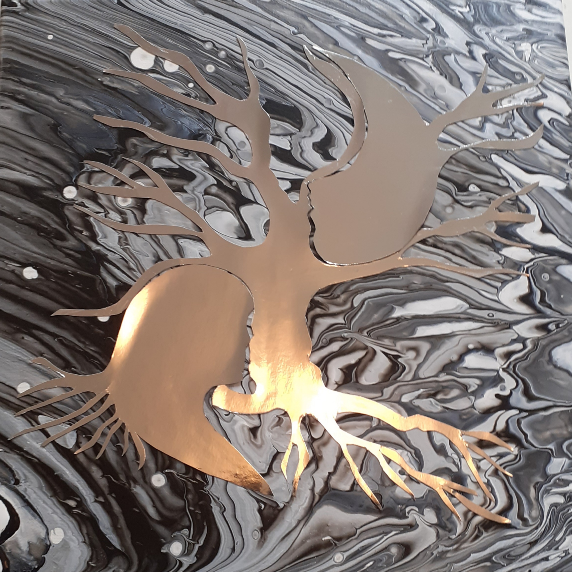 Acrylique sur toile lin 40 cm x 40cm, châssis bois, verni mat et collage miroir.