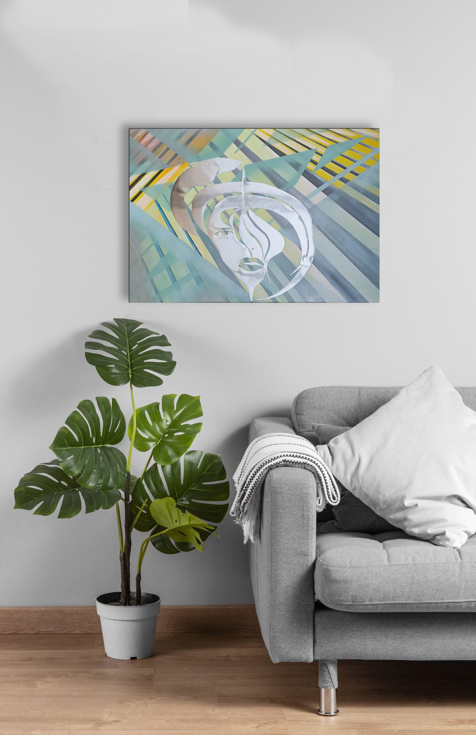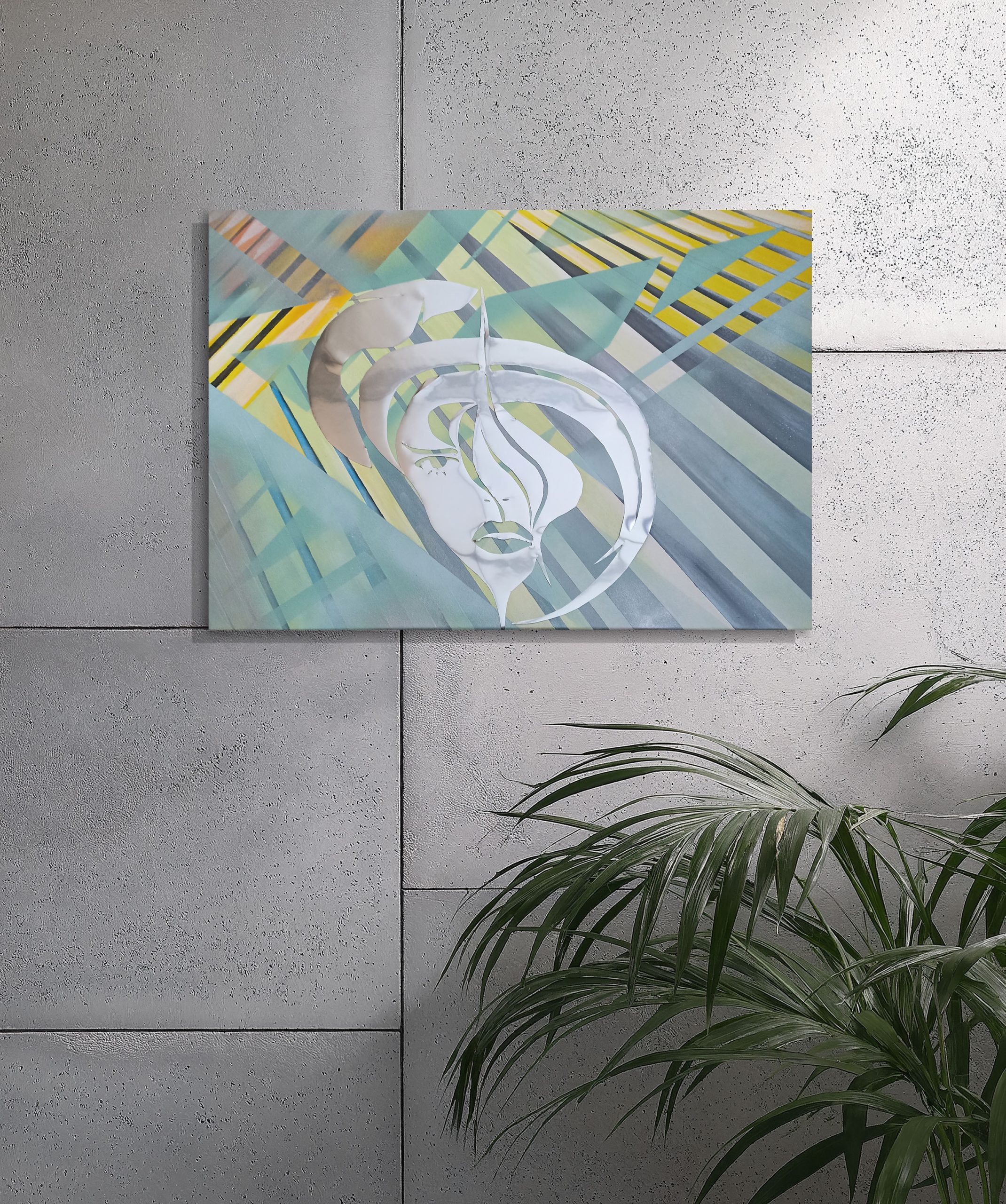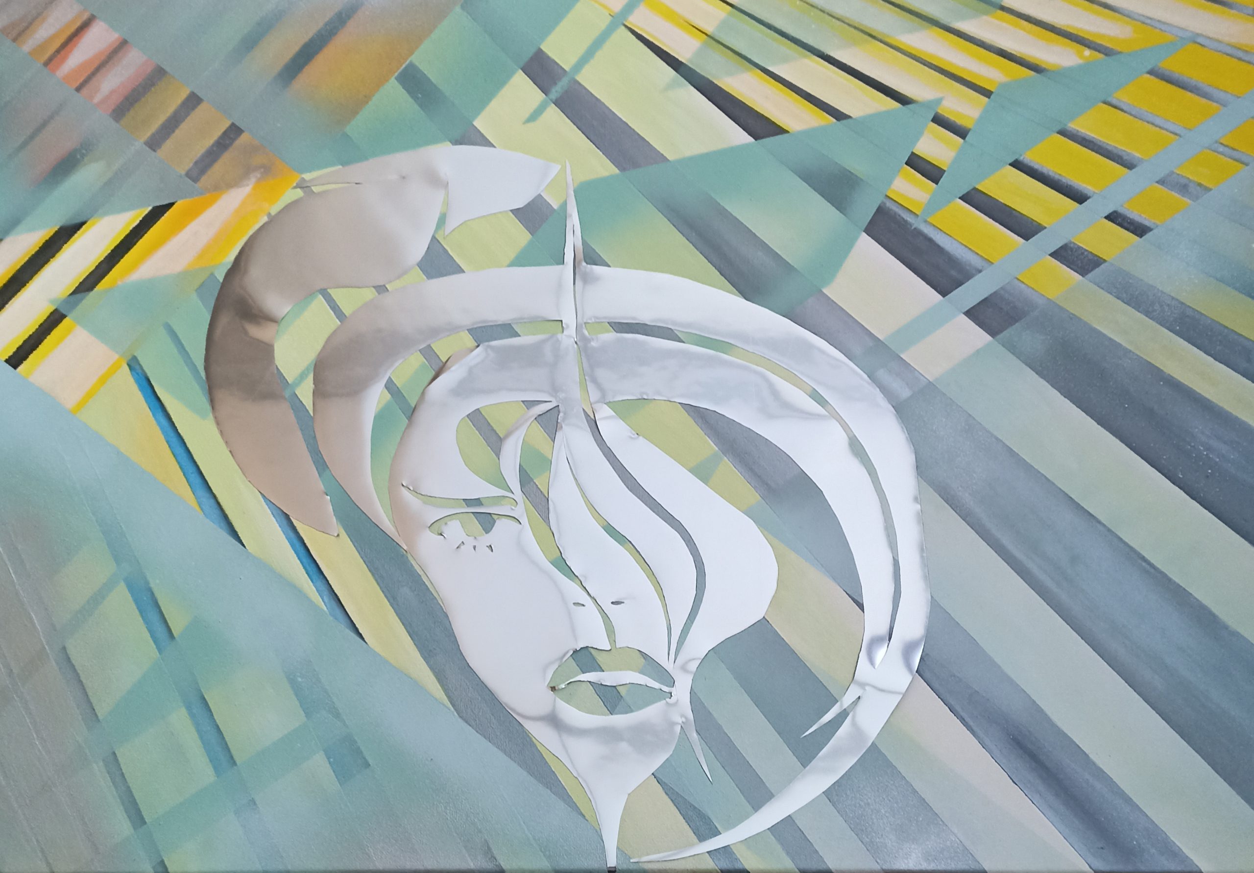 Acrylique sur toile lin 50 cm x 70cm, châssis bois, verni mat et collage miroir.